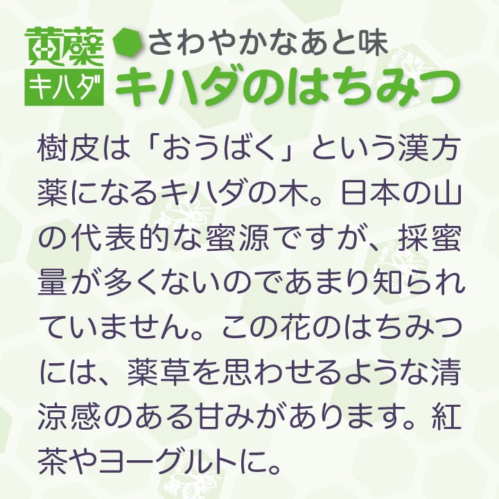 この花からできるはちみつには、薬草を思わせるような清涼感のある甘みがあります。ヨーグルトや紅茶などにおすすめです。